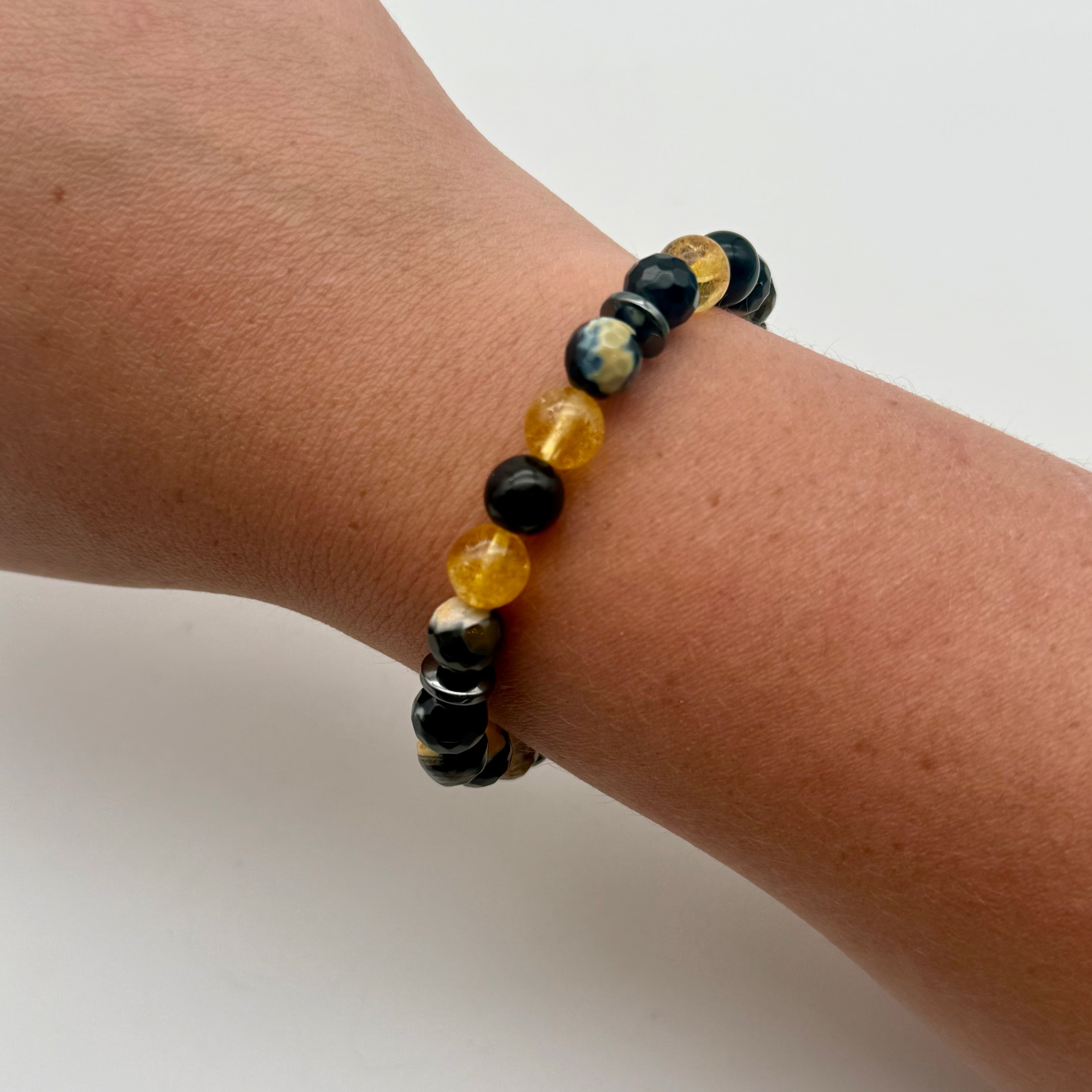 Hematite is a powerful stone that deflects any negative energy. It counteracts any confusion and spaciness - ensuring you stay focused on your new goal. It balances the auric field and helps align chakras. It will help you see the light at the end of the tunnel - supporting you in achieving your goals and dreams. When hematite touches your wrist, it makes you feel calmer and centred with its intense yet subtle vibrations.