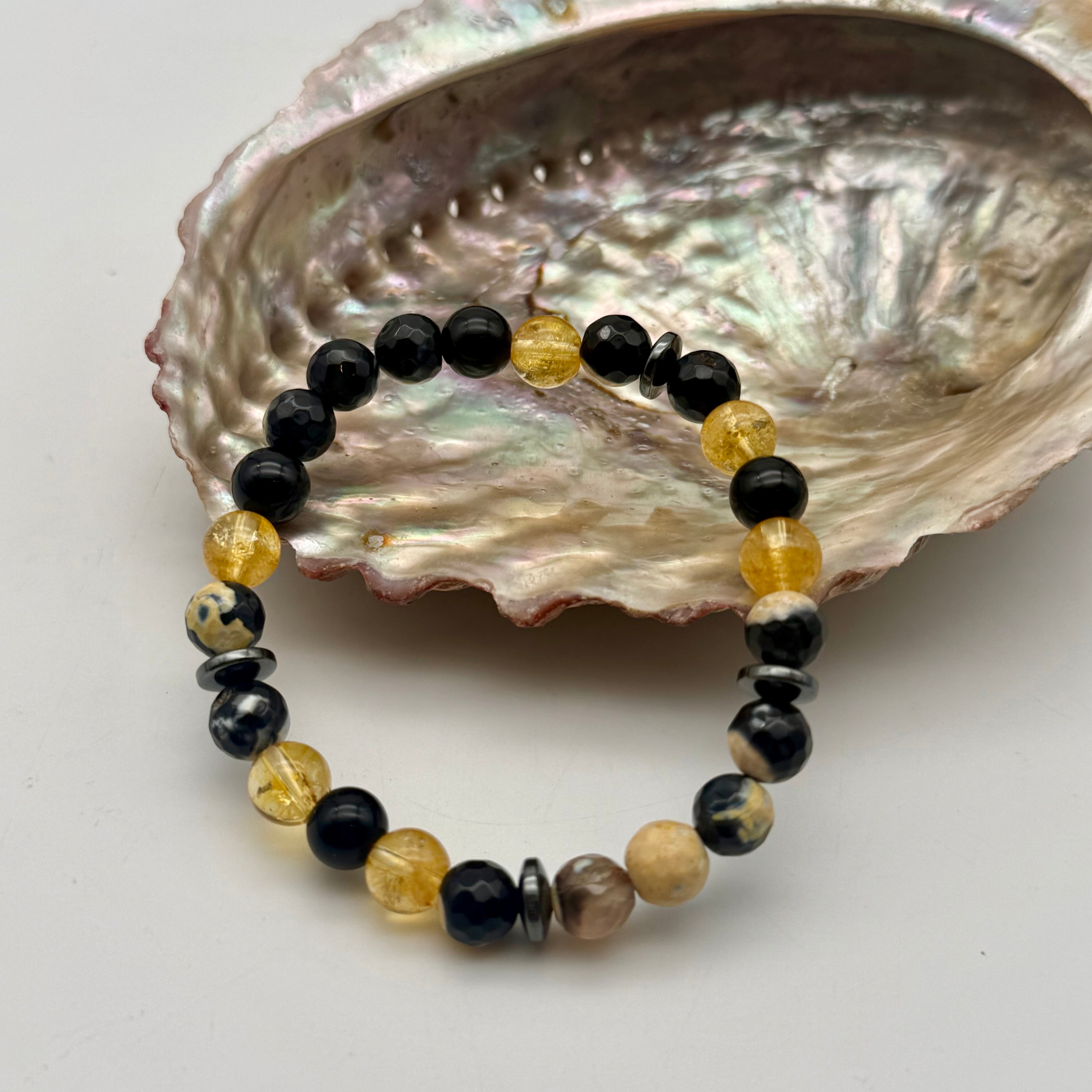 Hematite rondel, variegated black agate, black tourmaline, citrine