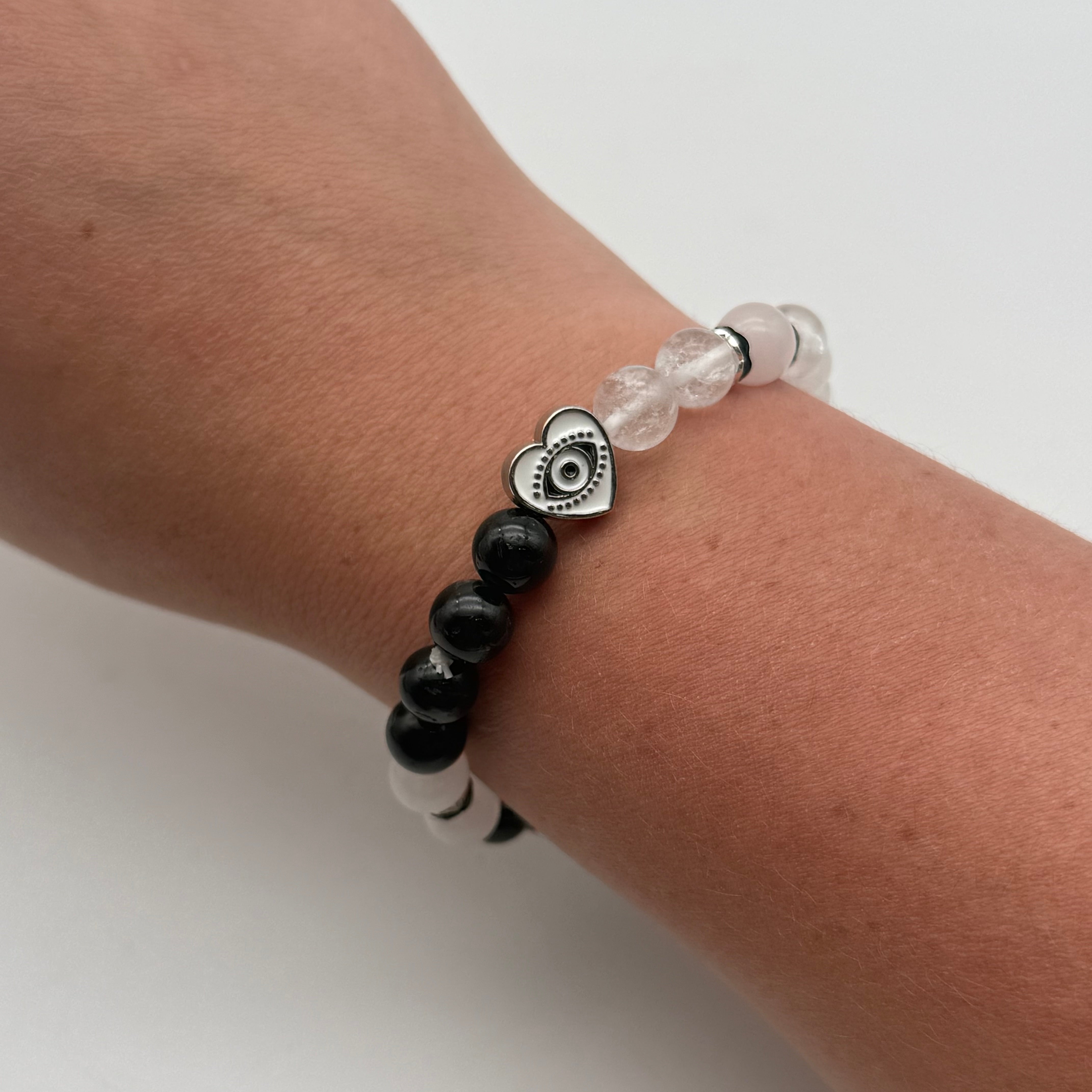 Metal evil eye heart charm, black tourmaline, quartz, rose quartz