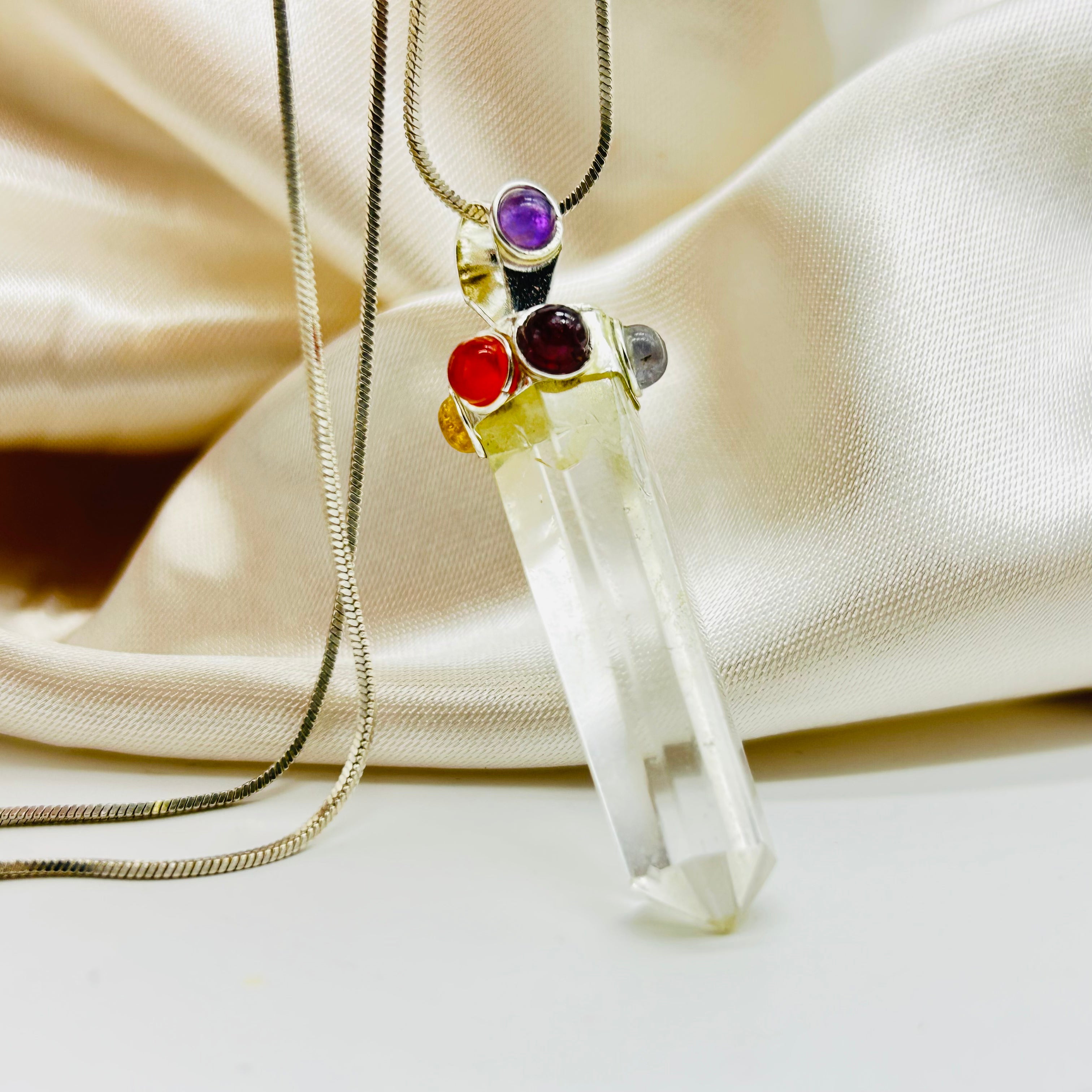 Clear Quartz Point With Cabochon Gemstones Metal Pendant