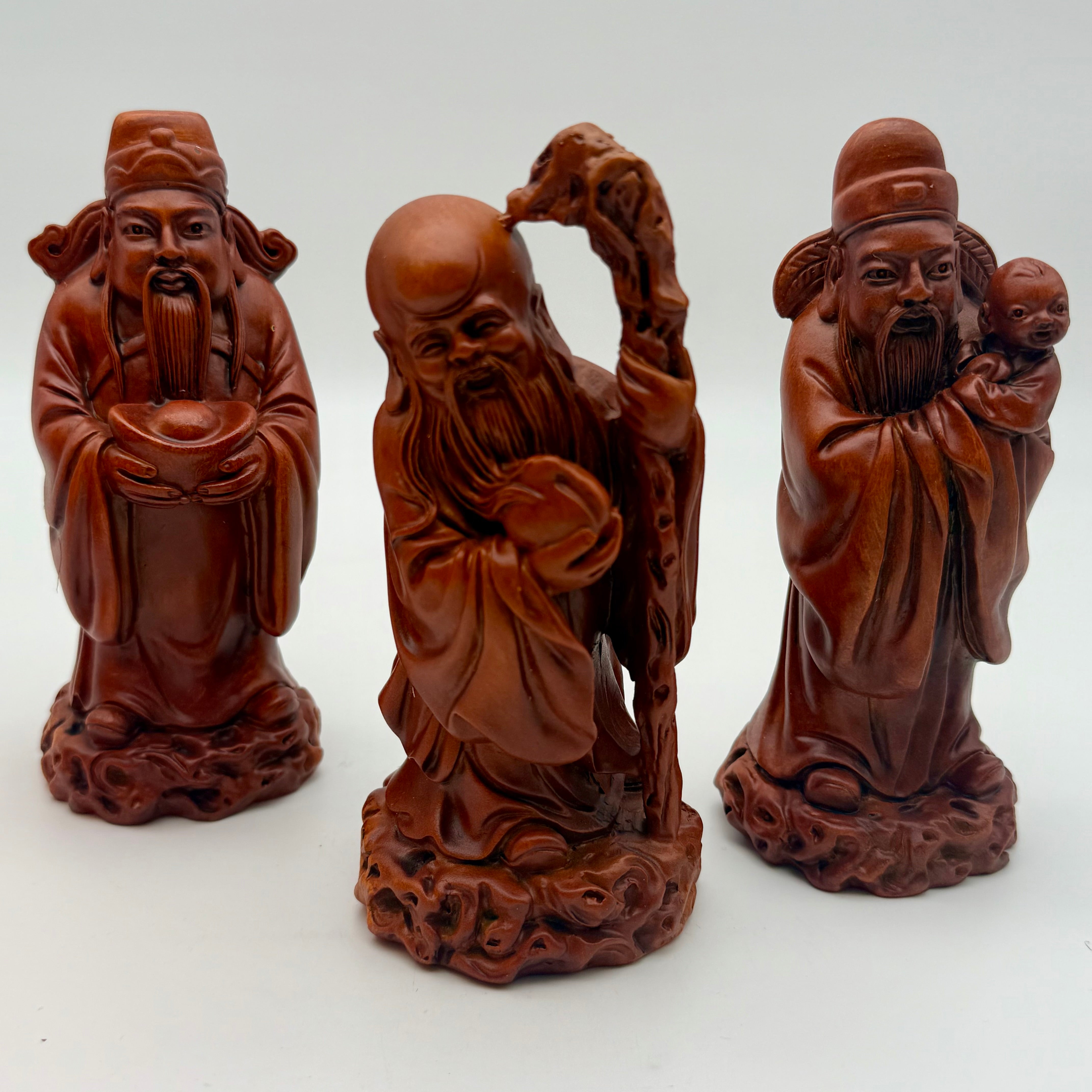 The deity Fuk represents planet Jupiter and is known to give luck, happiness, prosperity and wealth. Luk the deity is seen as holding golden ingots is the personification that attracts stability, fame, popularity, success and financial abundance. Sau, who is the symbol of immortality, is depicted as elderly man with a dragon-edged staff and a nectar bottle.