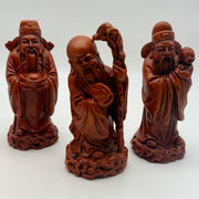 The Star of Longevity "Sau" is associated to the star in the south pole. This star is often being symbolized by an oldman with protruding forehead, white hair and beard whom attained immortality. He normally carries a dragon crutch, a peach, the fungus of immortality ling tzi and the wu lou (gourd) which have medicinal values. He often impart virtues to people on the secret of longevity and ask them to avoid greed, negative thinking and arrogance as principles to sustaining longevity and good health. His magical peach is blossomed from the heaven only every 3000 years. His image represents good health and longevity.