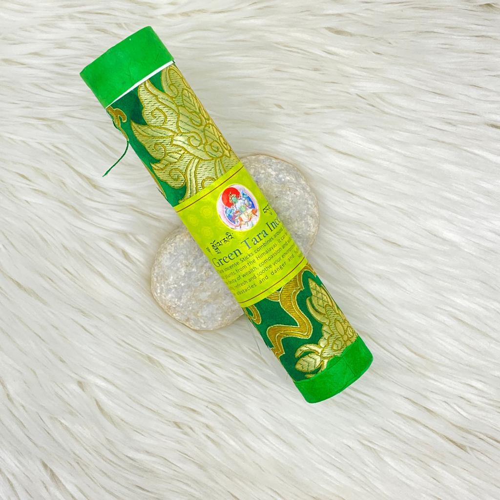 Green Tara Incense Sticks combines around 100 different medicines and aromatic plants from the Himalayas. It can be offered to Green Tara, the deity of wealth, compassion, and wish-fulfillment. It will also purify, refresh and soothe your environment, and yourself. It will remove obstacles and danger, whilst fulfilling your wishes.