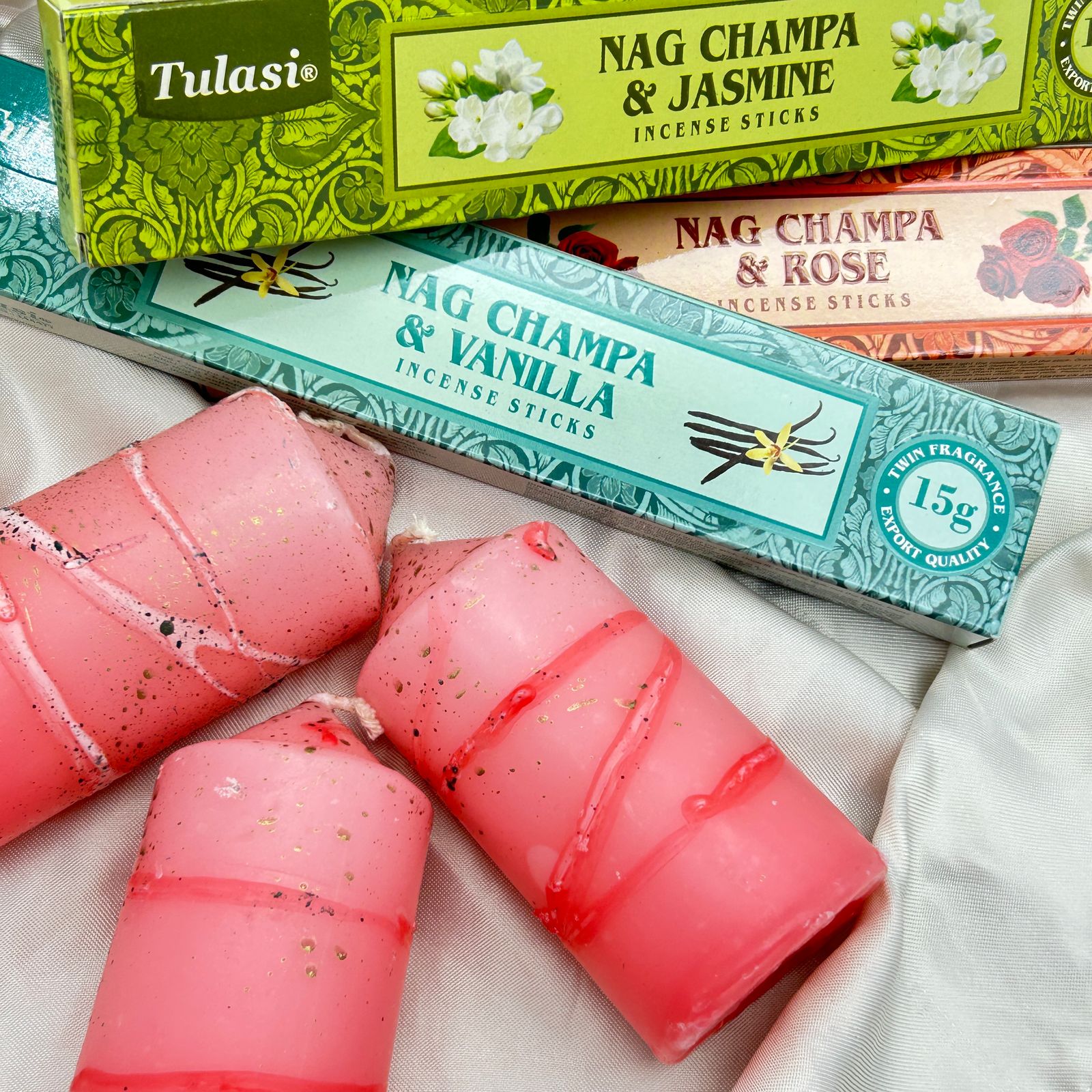 Create a sanctuary of warmth, love, and serenity in your space with our Sacred Love & Light Kit. This specially curated set combines the soft glow of pink-speckled candles with the gentle, aromatic magic of three Tulasi Nag Champa incense blends: Rose, Vanilla, and Jasmine.