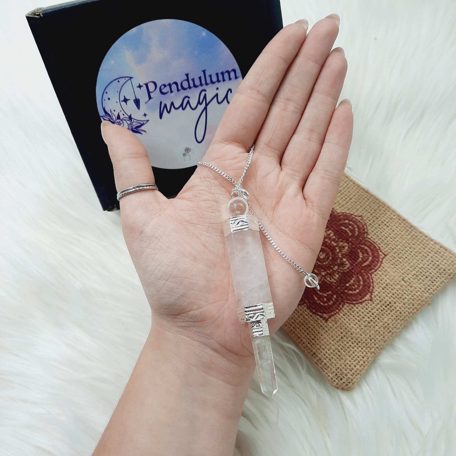 Clasped with white metal on either side is a genuine clear quartz point and a genuine crystal ball on the other. It can be used as a pendulum for dowsing and a wand to transmit energy from you to wherever you desire to send it.