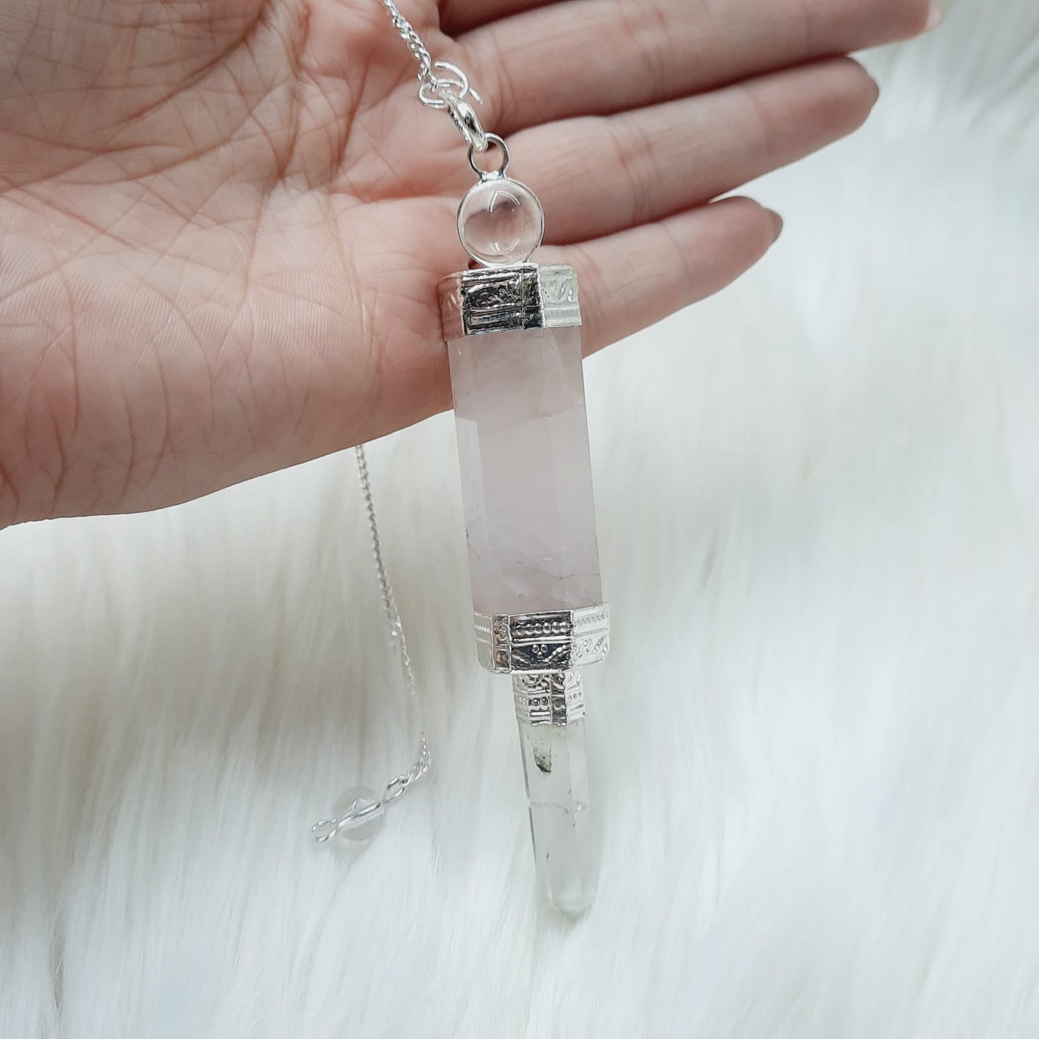 This pendulum is excellent for healing. You can use the clear quartz point to transmit healing and help you rebalance the chakras and meridians. Rose quartz emits a cool, calming energy which can work on the chakras to remove negativity gently. It relaxes people, so they don't feel so hurried. It helps restore the crown chakra and the mind back into harmony and balance. The rose quartz metal wand pendulum helps you get to the root of hidden problems and channel the correct information.