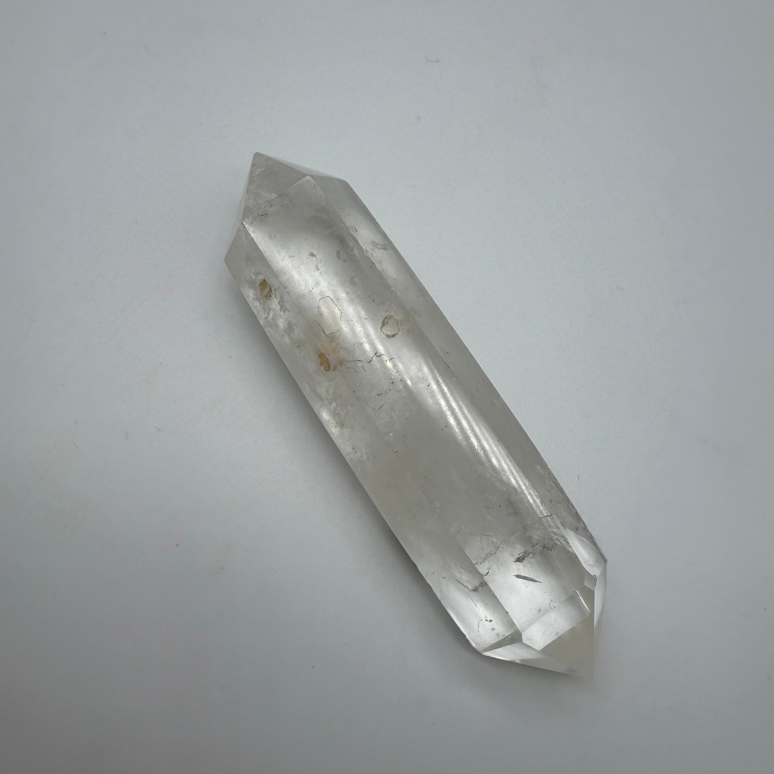 Clear quartz is a stone of light - bringing heightened spiritual awareness to whoever works with it. Clear quartz can be placed on all the chakras and energy meridians. The double terminated clear quartz as the name implies has two terminations at each end of the crystal body. The double spiral growth allows energy to flow in both directions along the body of the stone. Double terminated quartz can both receive and transmit energy through either termination. Double terminated quartz can be used to bridge blockages in the energy field , meridians or chakras . They assist one in expanding their consciousness at the same time that they help dispel excess energy and ground the body.