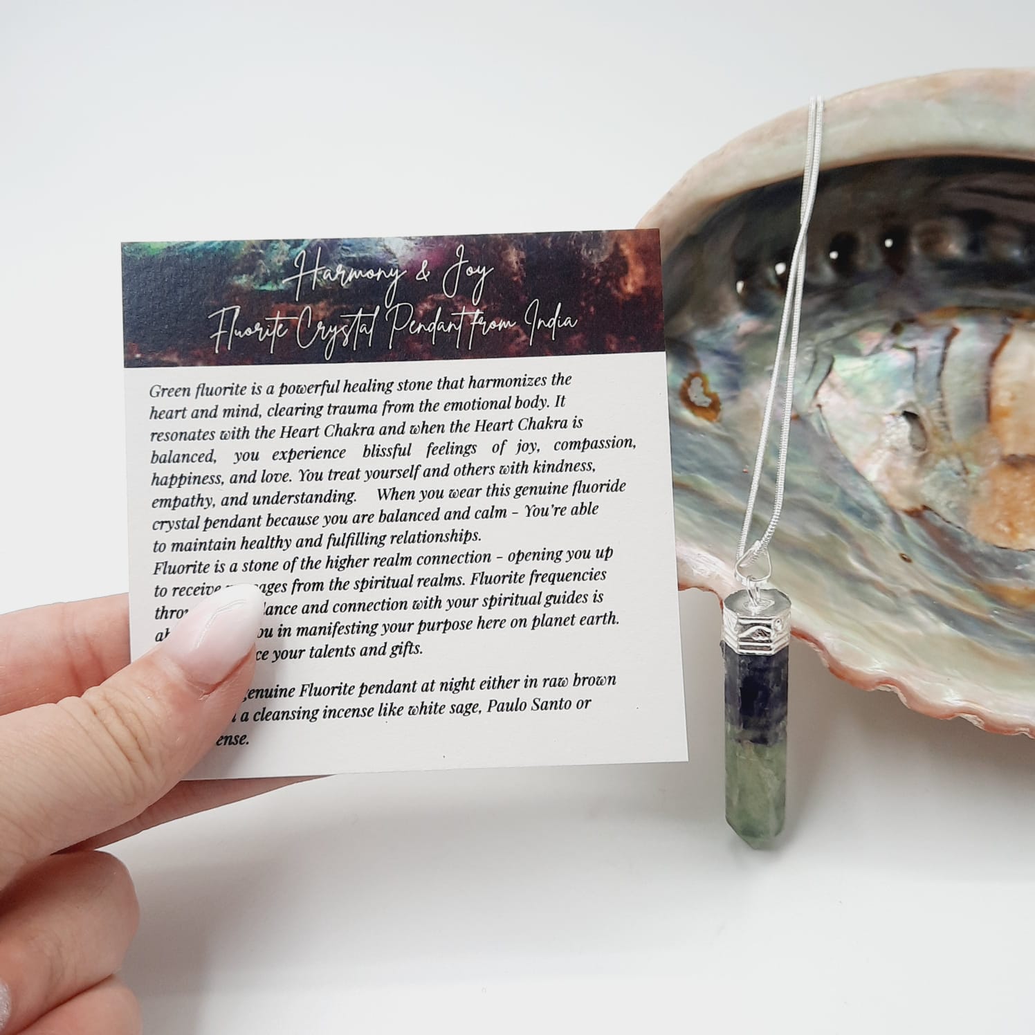 cleanse this genuine Fluorite pendant at night either in raw brown rice or with a cleansing incense like white sage, Paulo Santo or frankincense.