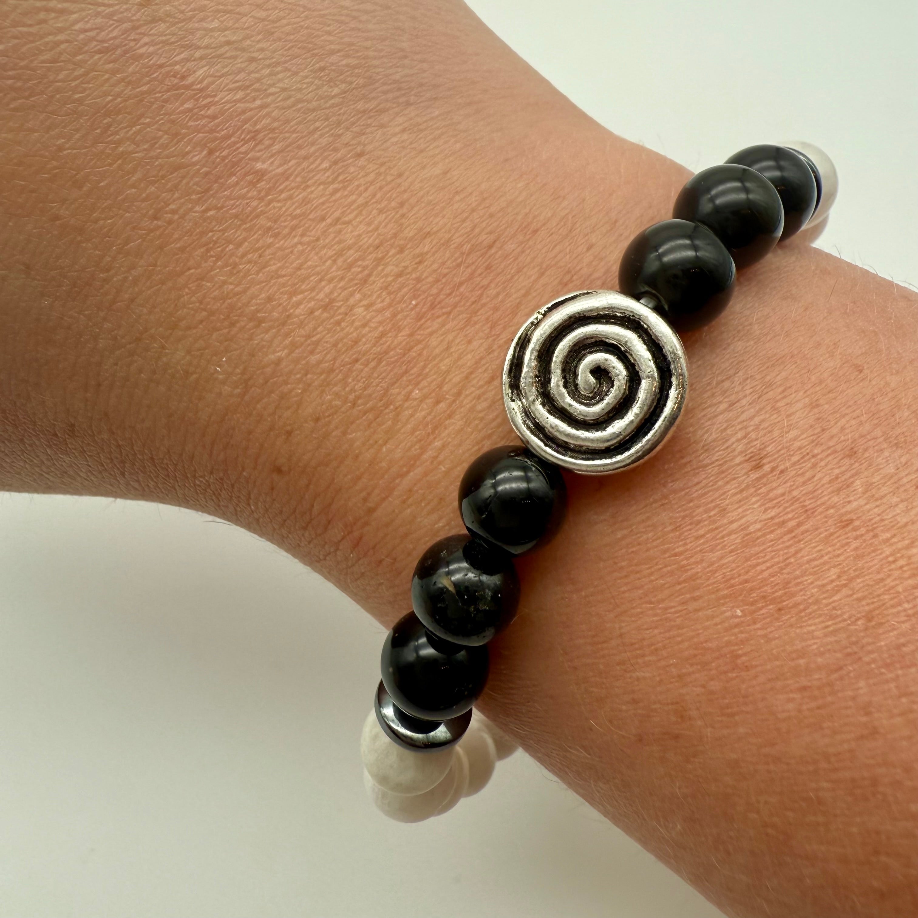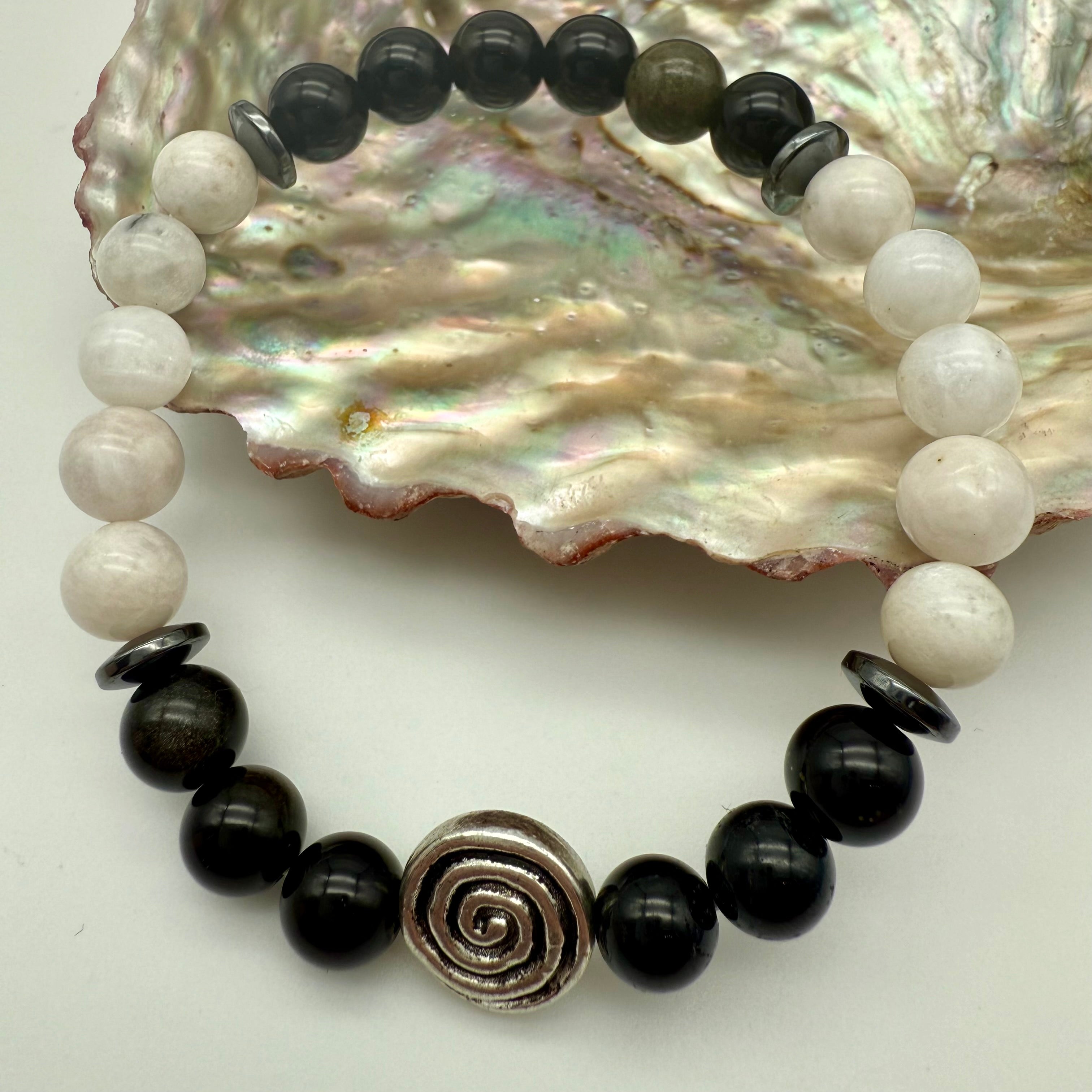 Obsidian, blue moonstone, hematite roundels, spiral charm